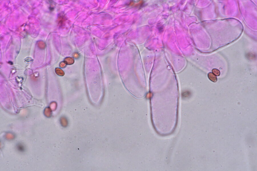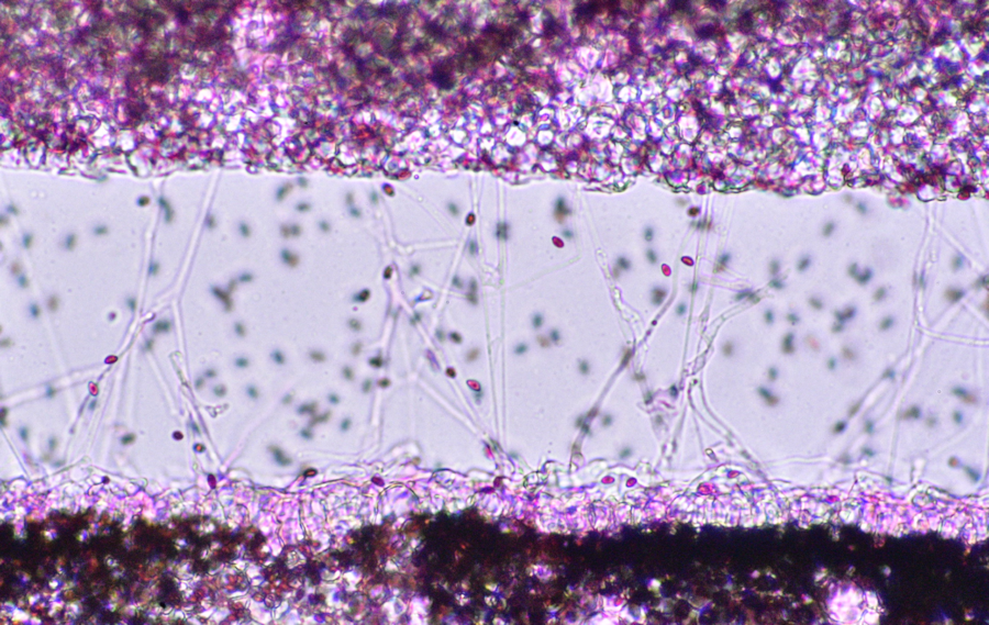 先ほど想像の中で菌糸が作り出した「筒」かも、と言いましたが、これが果たして菌糸が作り出したものなのか?それともやはりシスチジアなのか・・・・