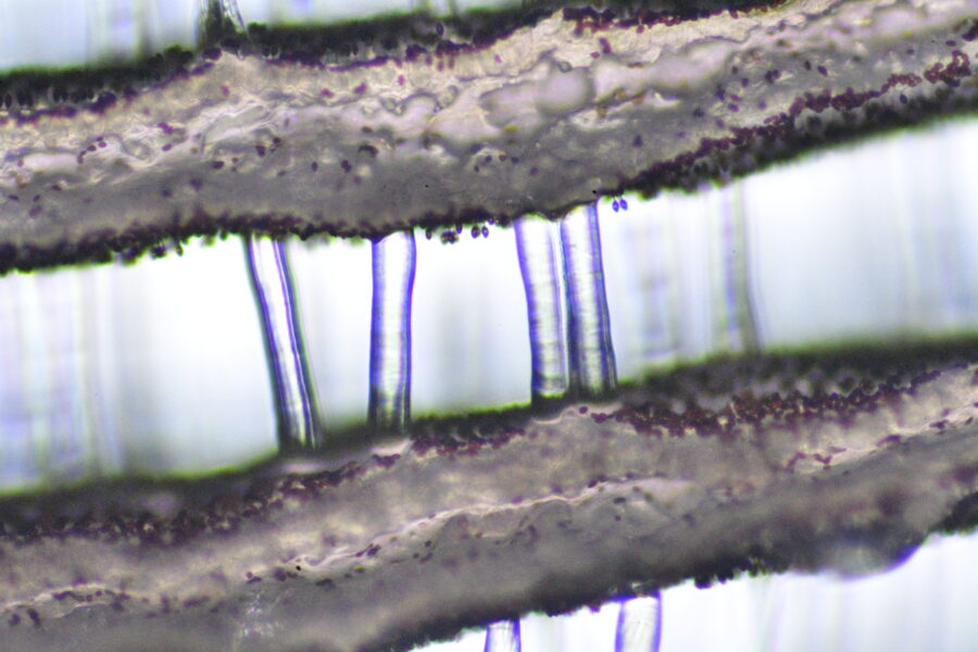 これはヒダの細胞をピンセットで摘まんで検鏡したものです。