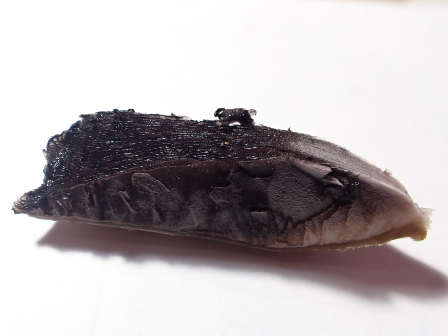しかし、生のキノコ、しかももうドロドロに溶けてきている状態で横にスライスするのは不器用な僕にとっては至難の業で、やっとこ切り出すことが出来たのが以下の写真です。