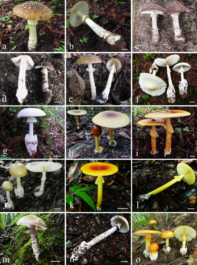 Fresh basidiomata of novel species in Amanita sect. Amanita and A. sect. Caesareae.