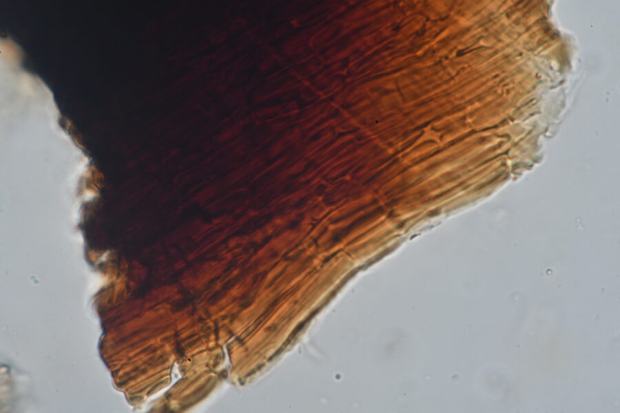 非常に硬く、薄く切るのが大変なのですが、切片の端っこの部分を観察してみると菌糸の様な形状のものがずらっと並んでいるのが分かりますでしょうか?
