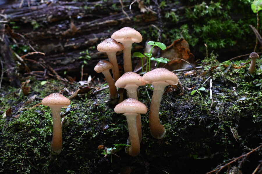 この写真はハイキング道脇に寝かされているスギの木から発生しているナラタケの仲間です。良く見るのはコナラの倒木から発生しているのを見るのですが、条件が合えばこの様に針葉樹をも食料にしてしまいます。もちろんこのスギの樹皮は根状菌糸束に羽交い絞めにされたように黒いひも状組織に覆われていました。