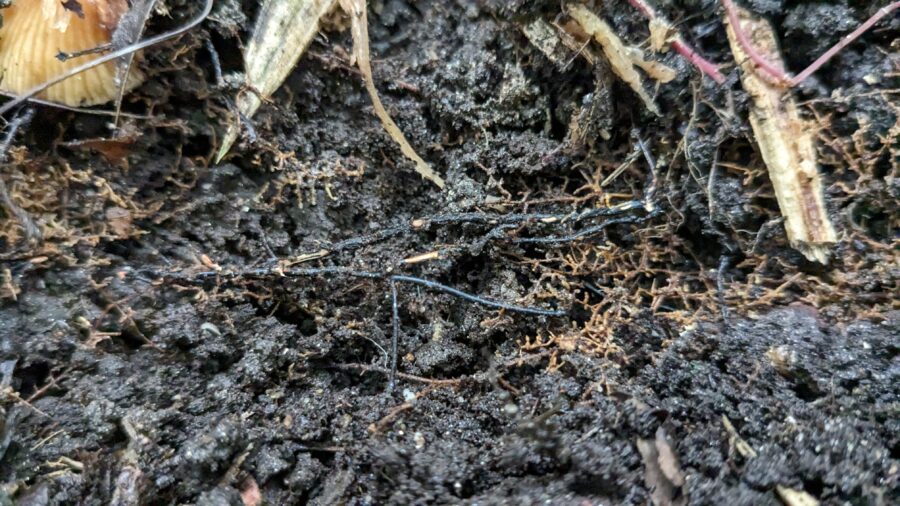 つまり根状菌糸束が地中でその生息域を拡大しているのは、黒くコーティングし外部からの侵入や乾燥から身を守り、より遠くへ獲物を探しに行くため、と考えて良いでしょう。