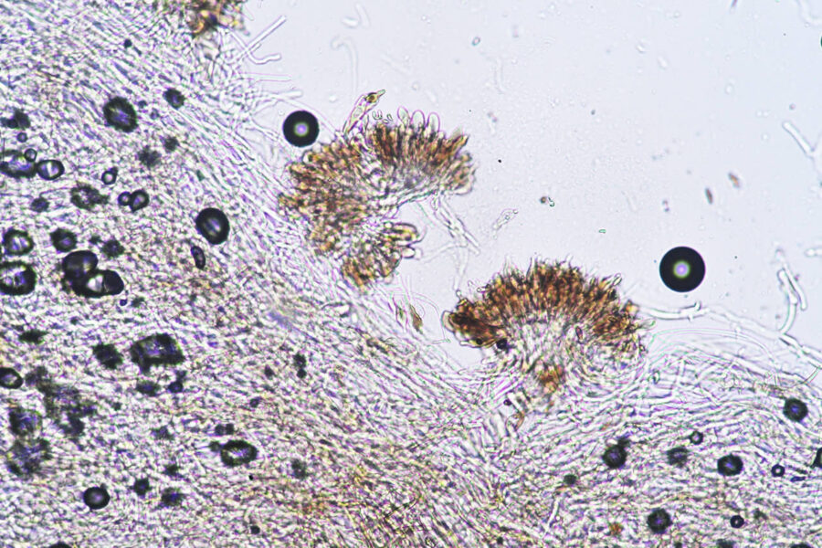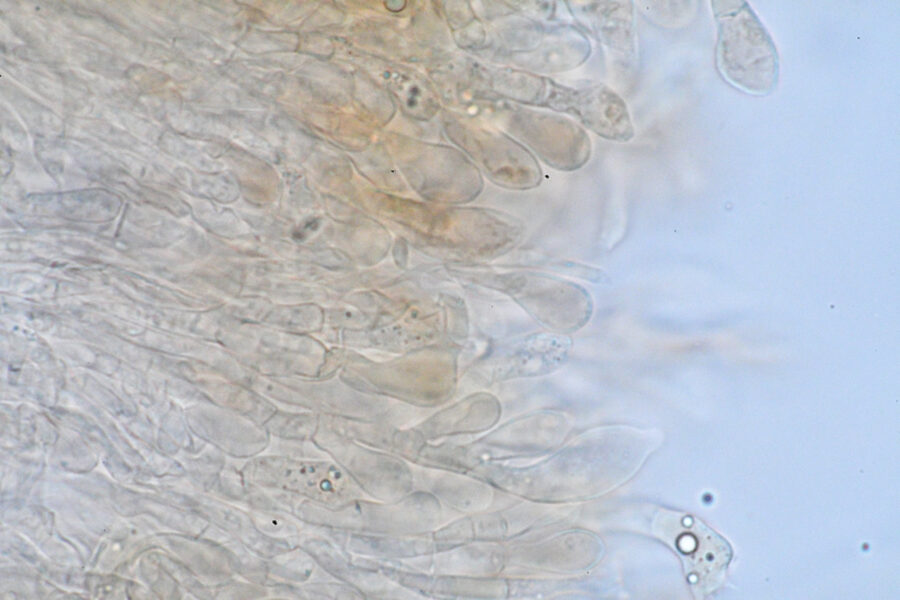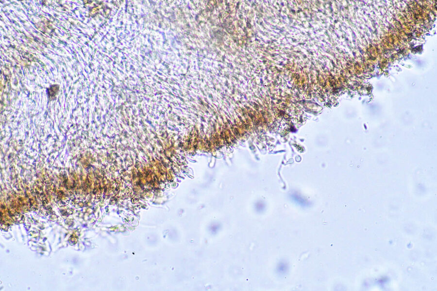 ヒダにはくっきりとフチドリがあり、それを顕微鏡で観察するとシスチジアであることがわかります。
