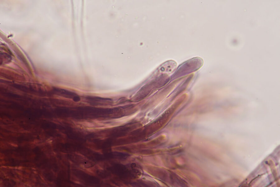 これをシスチジアと呼んで良いのかはわかりませんが、ここでは便宜上シスチジア(または柄シスチジア)とさせてもらいます。