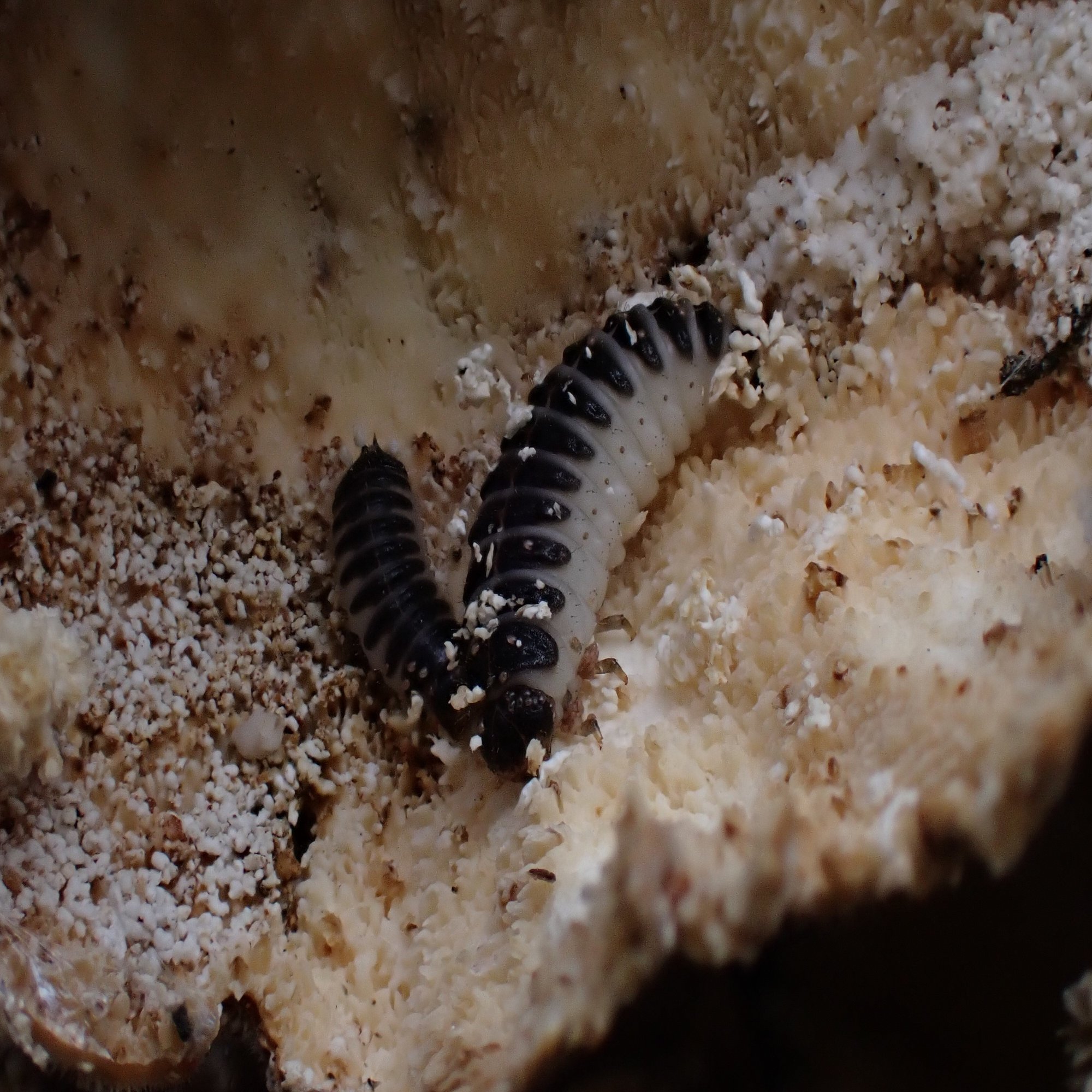 カワラタケを観察していると、高確率で「きのこむし」も一緒に観察することができます。前回紹介したヒトクチタケでもそうですが、きのこを食べている昆虫の中には、必ず訪れる常連さんがいるのです。