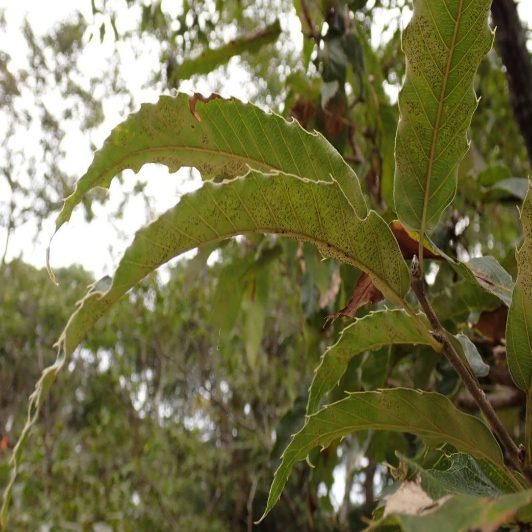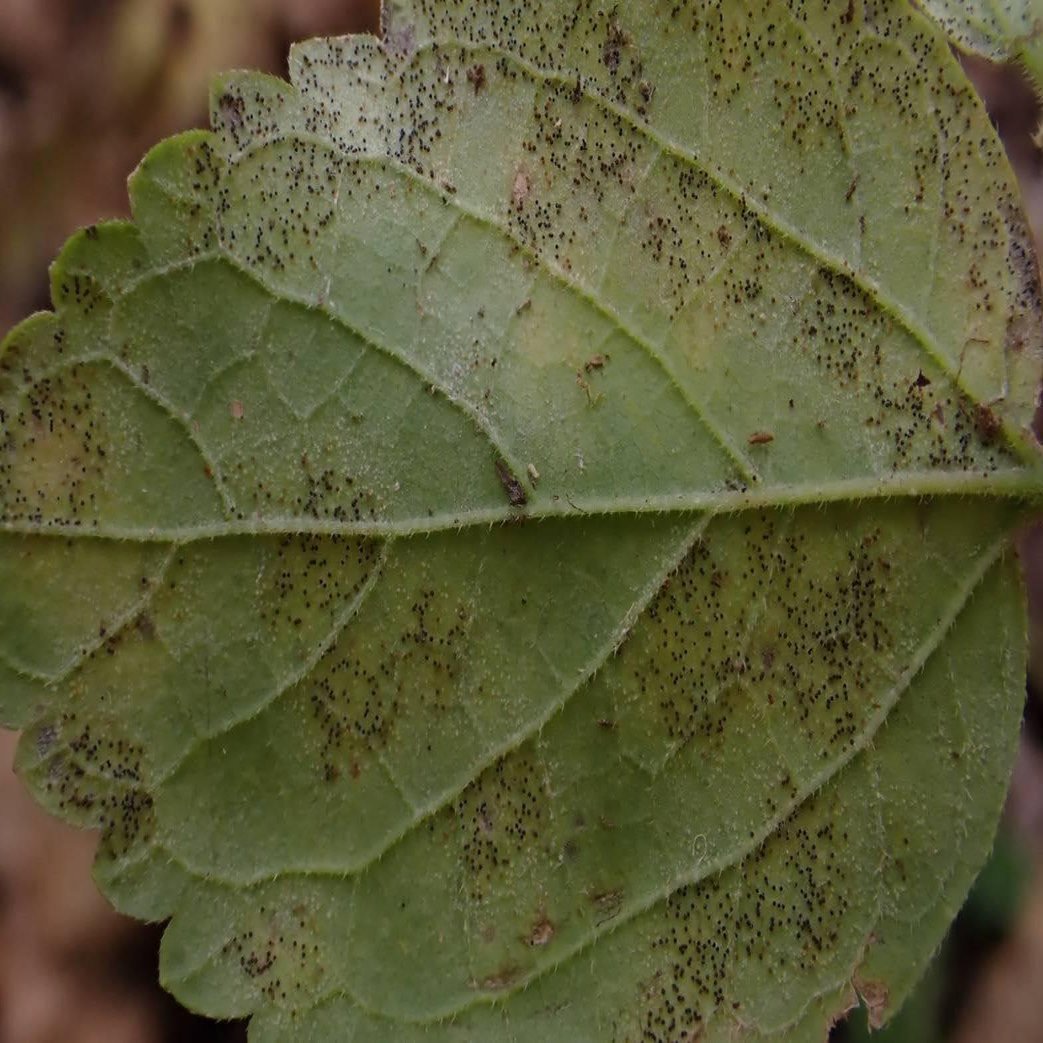 ウドンコカビ(クヌギ裏うどんこ病菌)が発生したクヌギの葉。葉裏に黒い点々がいくつも観察できました。